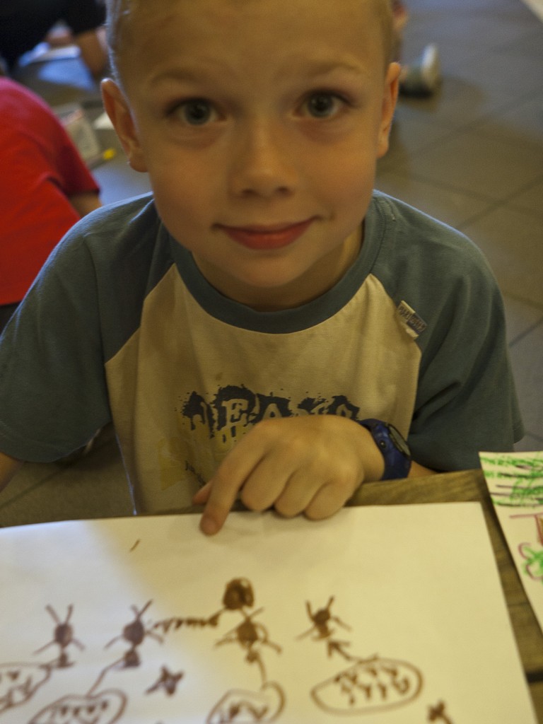 Wieczorem dla uporządkowania emocji i wrażeń z wczorajszego wieczoru pan Piotr przygotował prezentację dydaktyczną dotyczącą sytuacji ukąszenia i ugryzienia oraz reakcji na te okoliczności. Analiza tych wydarzeń, a także naszych zachowań została przełożona na ciekawe rysunki. Upewniło to nas w przekonaniu, że dzieci poradzą sobie w sytuacjach gdy natura zaskakuje.