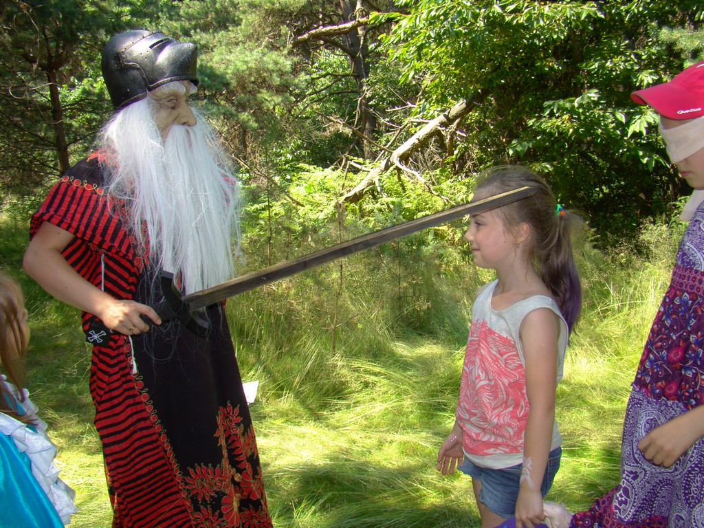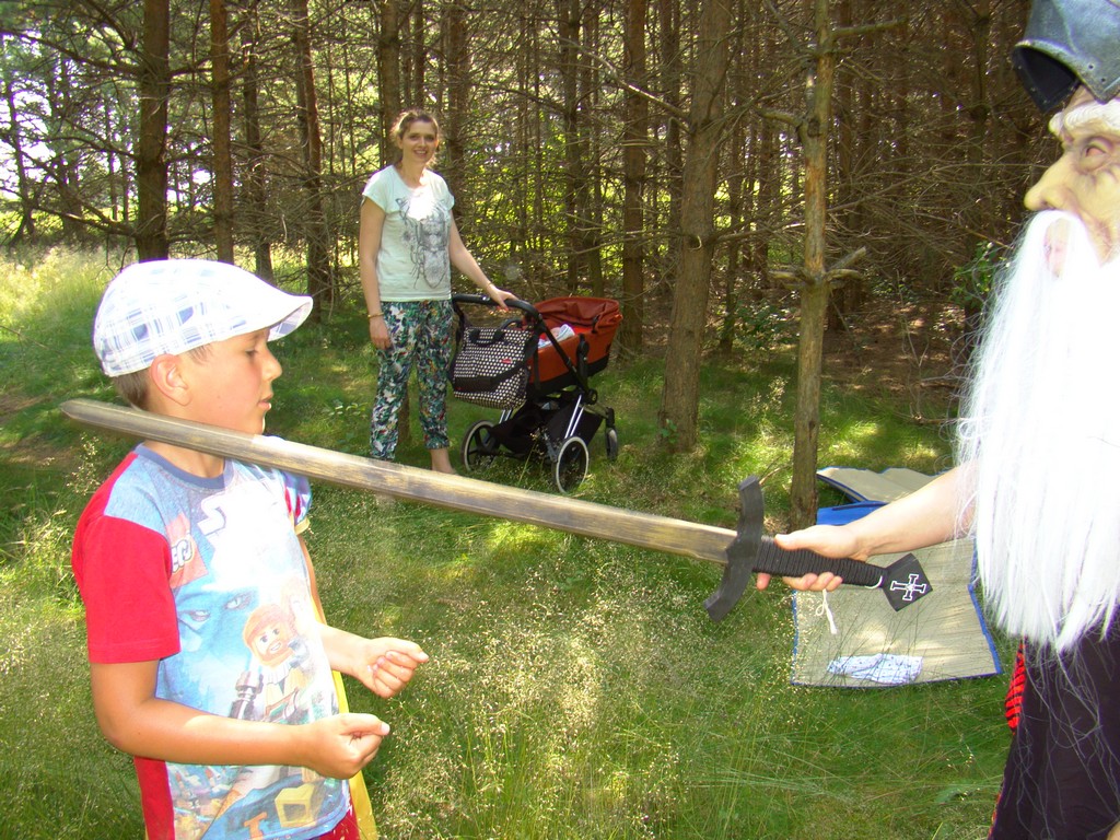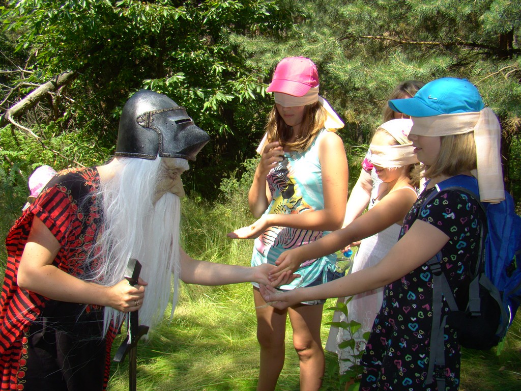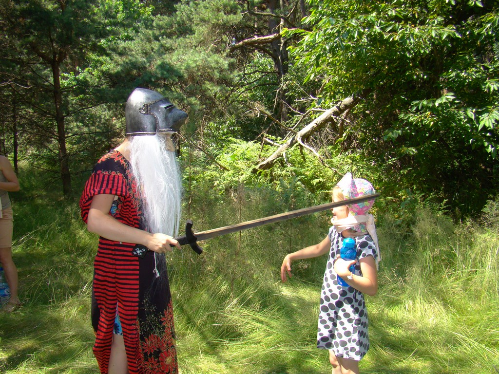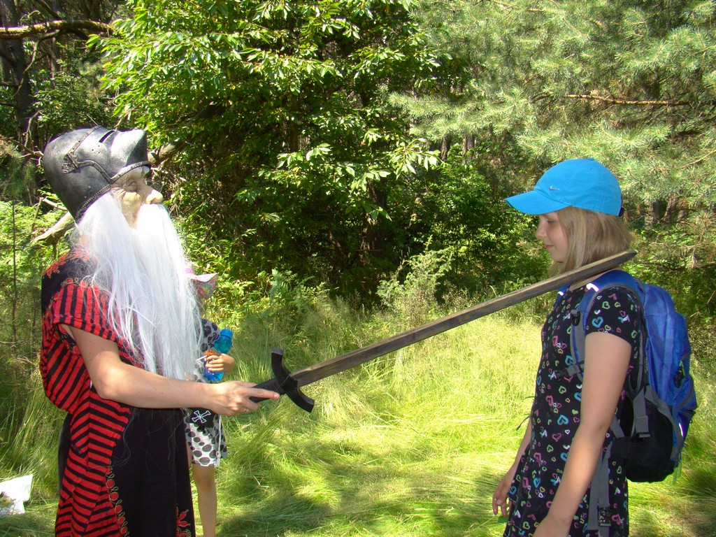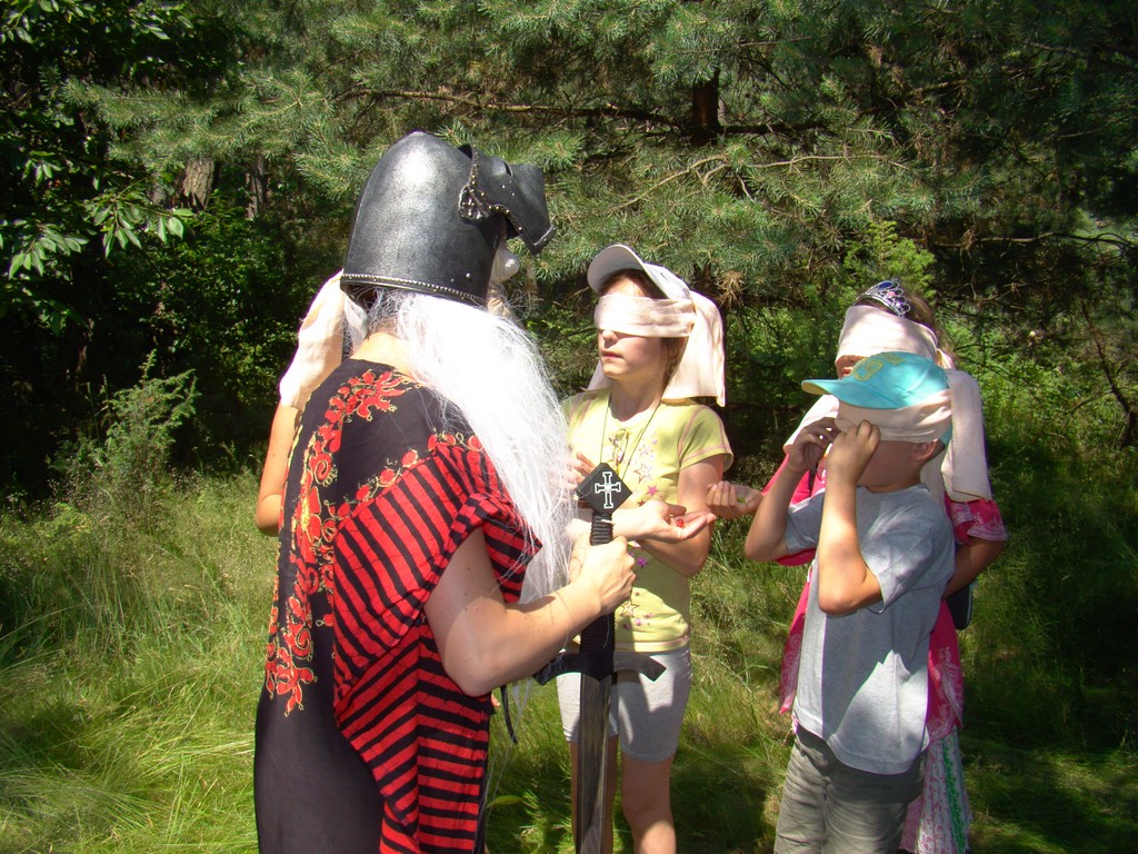 Przed nami postawiono liczne zadania, gdzie udowodnić musieliśmy naszą odwagę i twórczość oraz sprawność poruszania się w terenie. Na końcu drogi czekał na nas sługa prawowitego władcy Dobrowoja, który mianował nas na rycerzy i damy dworu Królestwa Korony. Po południowym posiłku rozpoczęliśmy poszukiwanie pierwszej części medalionu- „Bystre oko”. Wspierając się nawzajem odszukaliśmy wszystkie poszukiwane elementy przyrody w pobliskim lesie. Wieczorem spotkaliśmy się na niedzielnej Mszy Świętej w pobliskiej wiosce- Włodowice, która należy do Królestwa. Ukoronowaniem dnia było otrzymanie poszukiwanej części medalionu.